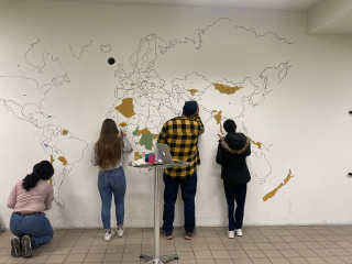 Wir haben die Welt an die Wand gemalt und gemerkt, wie klein die Schweiz ist, gelernt, dass Äthiopien neben Eritrea liegt und so weit weg ist... und wo Ronaldo jetzt Fussball spielt und dass das RIESIGE Ding da oben Russland ist und Kasachstan ist gar nicht so klein wie gedacht. Und was sind diese grossen Flecken? Das sind die 3 grossen Seen in Ostafrika, und da gibt es kleine "Meere" zwischen Ländern ... so viel zu entdecken!